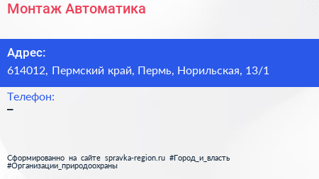 Монтаж-Автоматика по адресу 614012, Пермский край, Пермь, Норильская, 13/1 в дальнейшем Организация, размещена в следующих категориях: