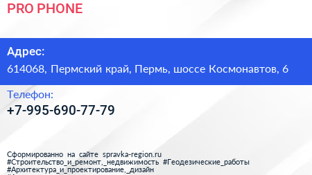 PRO PHONE по адресу 614068, Пермский край, Пермь, шоссе Космонавтов, 6 в дальнейшем Организация, размещена в следующих категориях: