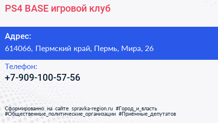 PS4 BASE, игровой клуб по адресу 614066, Пермский край, Пермь, Мира, 26 в дальнейшем Организация, размещена в следующих категориях: