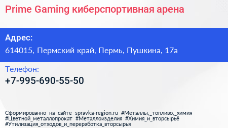 Prime Gaming, киберспортивная арена по адресу 614015, Пермский край, Пермь, Пушкина, 17а в дальнейшем Организация, размещена в следующих категориях: