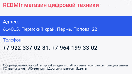 REDMIr, магазин цифровой техники по адресу 614015, Пермский край, Пермь, Попова, 22 в дальнейшем Организация, размещена в следующих категориях: