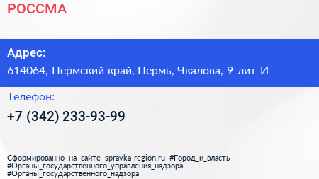 РОССМА по адресу 614064, Пермский край, Пермь, Чкалова, 9 лит И в дальнейшем Организация, размещена в следующих категориях: