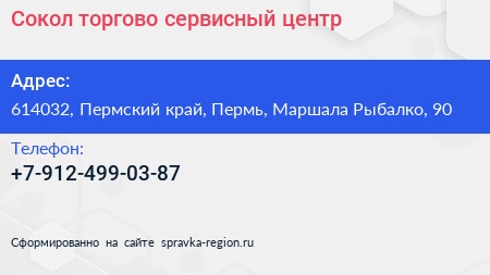 Сокол, торгово-сервисный центр по адресу 614032, Пермский край, Пермь, Маршала Рыбалко, 90 в дальнейшем Организация, размещена в следующих категориях: