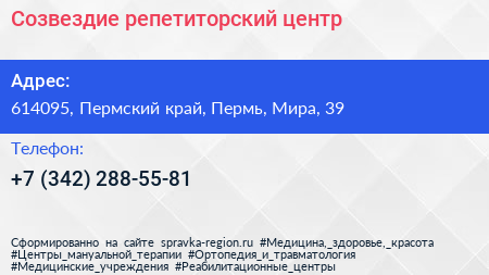 Созвездие, репетиторский центр по адресу 614095, Пермский край, Пермь, Мира, 39 в дальнейшем Организация, размещена в следующих категориях: