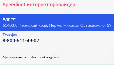 Speedinet, интернет-провайдер по адресу 614007, Пермский край, Пермь, Николая Островского, 59 в дальнейшем Организация, размещена в следующих категориях: