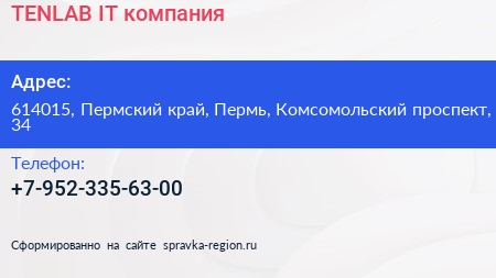 TENLAB, IT-компания по адресу 614015, Пермский край, Пермь, Комсомольский проспект, 34 в дальнейшем Организация, размещена в следующих категориях: