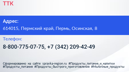 ТТК по адресу 614015, Пермский край, Пермь, Осинская, 8 в дальнейшем Организация, размещена в следующих категориях: