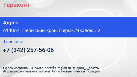 Тераконт по адресу 614064, Пермский край, Пермь, Чкалова, 9 в дальнейшем Организация, размещена в следующих категориях: