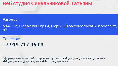 Веб-студия Синельниковой Татьяны по адресу 614039, Пермский край, Пермь, Комсомольский проспект, 62 в дальнейшем Организация, размещена в следующих категориях: