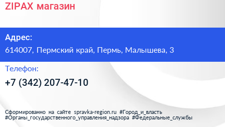 ZIPAX, магазин по адресу 614007, Пермский край, Пермь, Малышева, 3 в дальнейшем Организация, размещена в следующих категориях: