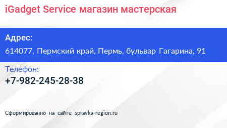 iGadget Service, магазин-мастерская по адресу 614077, Пермский край, Пермь, бульвар Гагарина, 91 в дальнейшем Организация, размещена в следующих категориях: