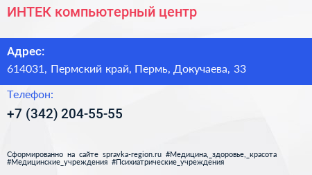 ИНТЕК, компьютерный центр по адресу 614031, Пермский край, Пермь, Докучаева, 33 в дальнейшем Организация, размещена в следующих категориях: