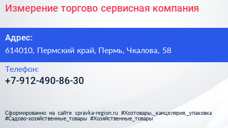 Измерение, торгово-сервисная компания по адресу 614010, Пермский край, Пермь, Чкалова, 58 в дальнейшем Организация, размещена в следующих категориях: