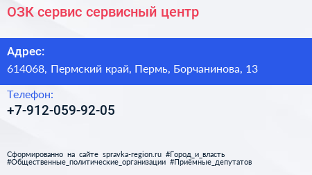 ОЗК сервис, сервисный центр по адресу 614068, Пермский край, Пермь, Борчанинова, 13 в дальнейшем Организация, размещена в следующих категориях: