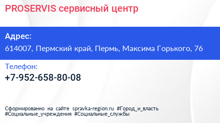 PROSERVIS, сервисный центр по адресу 614007, Пермский край, Пермь, Максима Горького, 76 в дальнейшем Организация, размещена в следующих категориях: