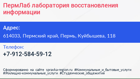 ПермЛаб, лаборатория восстановления информации по адресу 614033, Пермский край, Пермь, Куйбышева, 118 в дальнейшем Организация, размещена в следующих категориях: