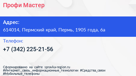 Профи Мастер по адресу 614014, Пермский край, Пермь, 1905 года, 6а в дальнейшем Организация, размещена в следующих категориях: