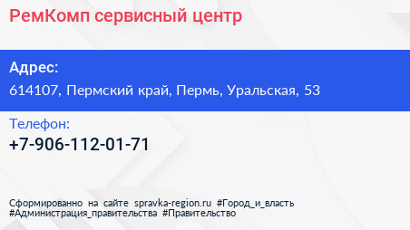 РемКомп, сервисный центр по адресу 614107, Пермский край, Пермь, Уральская, 53 в дальнейшем Организация, размещена в следующих категориях: