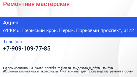Ремонтная мастерская по адресу 614046, Пермский край, Пермь, Парковый проспект, 31/2 в дальнейшем Организация, размещена в следующих категориях:
