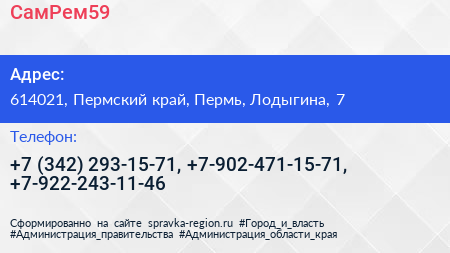 СамРем59 по адресу 614021, Пермский край, Пермь, Лодыгина, 7 в дальнейшем Организация, размещена в следующих категориях: