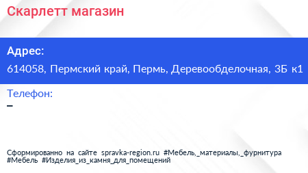 Скарлетт, магазин по адресу 614058, Пермский край, Пермь, Деревообделочная, 3Б к1 в дальнейшем Организация, размещена в следующих категориях: