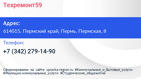 Техремонт59 по адресу 614015, Пермский край, Пермь, Пермская, 8 в дальнейшем Организация, размещена в следующих категориях: