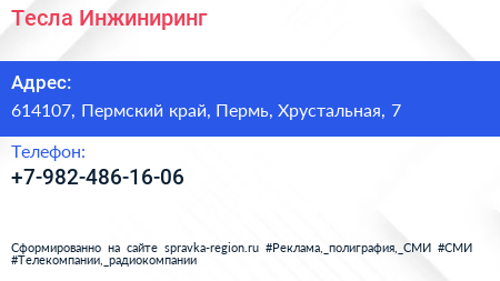 Тесла Инжиниринг по адресу 614107, Пермский край, Пермь, Хрустальная, 7 в дальнейшем Организация, размещена в следующих категориях: