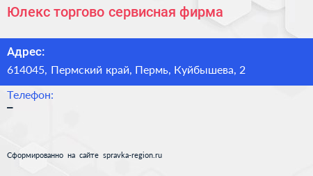 Юлекс, торгово-сервисная фирма по адресу 614045, Пермский край, Пермь, Куйбышева, 2 в дальнейшем Организация, размещена в следующих категориях: