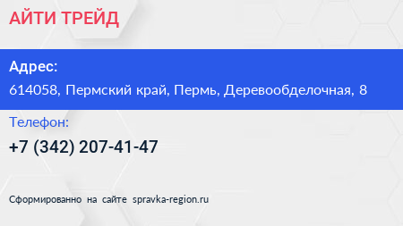 АЙТИ-ТРЕЙД по адресу 614058, Пермский край, Пермь, Деревообделочная, 8 в дальнейшем Организация, размещена в следующих категориях: