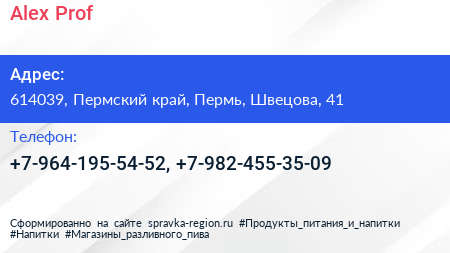 Alex Prof по адресу 614039, Пермский край, Пермь, Швецова, 41 в дальнейшем Организация, размещена в следующих категориях: