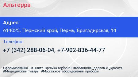 Альтерра по адресу 614025, Пермский край, Пермь, Бригадирская, 14 в дальнейшем Организация, размещена в следующих категориях: