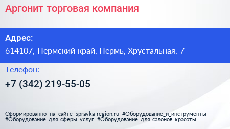 Аргонит, торговая компания по адресу 614107, Пермский край, Пермь, Хрустальная, 7 в дальнейшем Организация, размещена в следующих категориях: