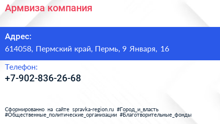 Армвиза, компания по адресу 614058, Пермский край, Пермь, 9 Января, 16 в дальнейшем Организация, размещена в следующих категориях: