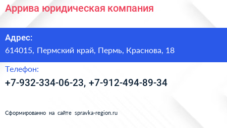 Аррива, юридическая компания по адресу 614015, Пермский край, Пермь, Краснова, 18 в дальнейшем Организация, размещена в следующих категориях: