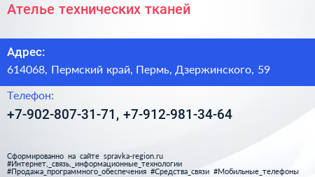 Ателье технических тканей по адресу 614068, Пермский край, Пермь, Дзержинского, 59 в дальнейшем Организация, размещена в следующих категориях: