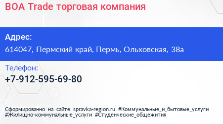 BOA-Trade, торговая компания по адресу 614047, Пермский край, Пермь, Ольховская, 38а в дальнейшем Организация, размещена в следующих категориях: