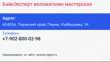 БайкЭксперт, веломагазин-мастерская по адресу 614016, Пермский край, Пермь, Куйбышева, 54 в дальнейшем Организация, размещена в следующих категориях: