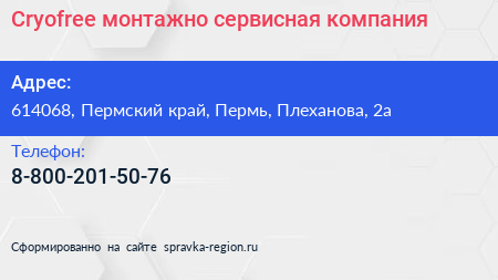 Cryofree, монтажно-сервисная компания по адресу 614068, Пермский край, Пермь, Плеханова, 2а в дальнейшем Организация, размещена в следующих категориях: