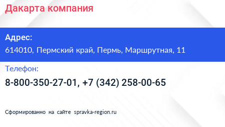 Для связи с организацией воспользуйтесь номером телефона: 8-800-350-27-01, +7 (342) 258-00-65. Пн: c 09:00-20:00, Вт: c 09:00-20:00, Ср: c 09:00-20:00, Чт: c 09:00-20:00, Пт: c 09:00-20:00, Сб: выходной, Вс: выходной, вы можете обратиться в эту организацию.