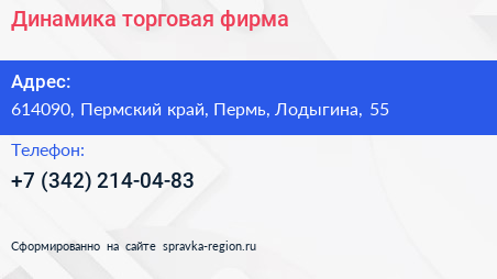 Динамика, торговая фирма по адресу 614090, Пермский край, Пермь, Лодыгина, 55 в дальнейшем Организация, размещена в следующих категориях: