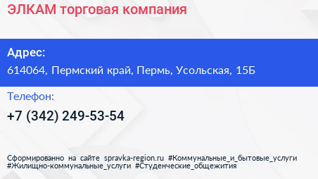 ЭЛКАМ, торговая компания по адресу 614064, Пермский край, Пермь, Усольская, 15Б в дальнейшем Организация, размещена в следующих категориях: