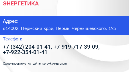 ЭНЕРГЕТИКА по адресу 614002, Пермский край, Пермь, Чернышевского, 19а в дальнейшем Организация, размещена в следующих категориях: