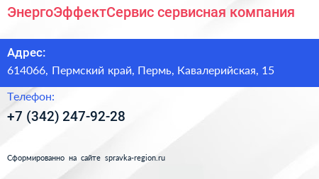 ЭнергоЭффектСервис, сервисная компания по адресу 614066, Пермский край, Пермь, Кавалерийская, 15 в дальнейшем Организация, размещена в следующих категориях: