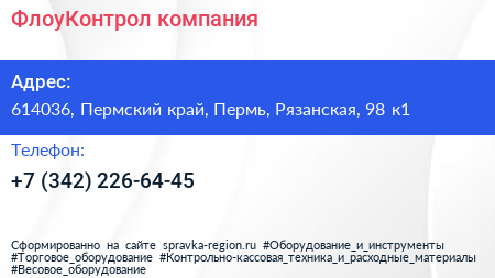 ФлоуКонтрол, компания по адресу 614036, Пермский край, Пермь, Рязанская, 98 к1 в дальнейшем Организация, размещена в следующих категориях: