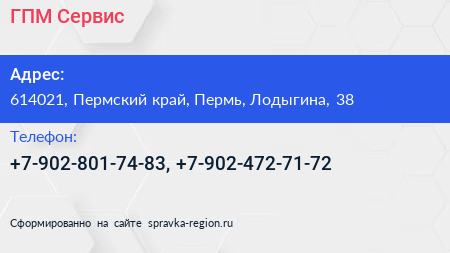 ГПМ-Сервис по адресу 614021, Пермский край, Пермь, Лодыгина, 38 в дальнейшем Организация, размещена в следующих категориях: