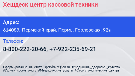Хешдеск, центр кассовой техники по адресу 614089, Пермский край, Пермь, Горловская, 92а в дальнейшем Организация, размещена в следующих категориях: