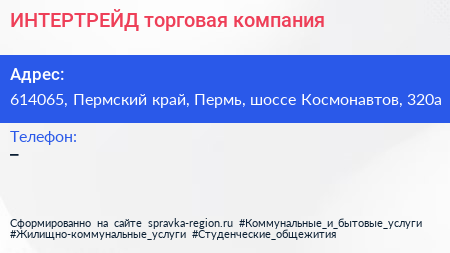 ИНТЕРТРЕЙД, торговая компания по адресу 614065, Пермский край, Пермь, шоссе Космонавтов, 320а в дальнейшем Организация, размещена в следующих категориях: