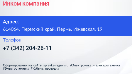 Инком, компания по адресу 614064, Пермский край, Пермь, Ижевская, 19 в дальнейшем Организация, размещена в следующих категориях: