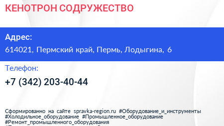 КЕНОТРОН СОДРУЖЕСТВО по адресу 614021, Пермский край, Пермь, Лодыгина, 6 в дальнейшем Организация, размещена в следующих категориях: