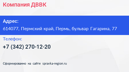 Компания ДВВК по адресу 614077, Пермский край, Пермь, бульвар Гагарина, 77 в дальнейшем Организация, размещена в следующих категориях: